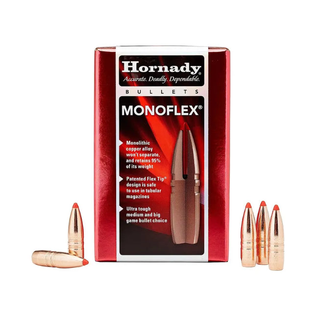 Equip your firearm with reliability when you use the Hornady MonoFlex 45 Cal .458 250-Grain Rifle Reloading Bullets - 50-Rounds. This 45 Cal .458 caliber ammo is suitable for medium and large game hunting from 50 to 1500 pounds. The 1-piece, copper alloy monolithic construction is complemented with secant ogive profiles and Flex Tip® designs. Comes with 50 rounds per box.
