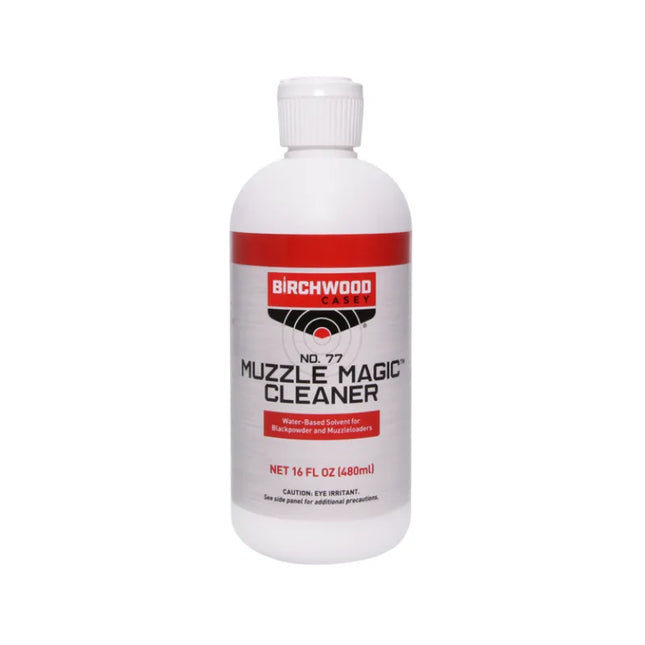 PREVENT RUST AND LOSS OF ACCURACY FROM BLACKPOWDER FOULING BY CLEANING YOUR MUZZLELOADER WITH NO. 77 – THE TRADITIONAL, WATER-SOLUBLE CLEANER. SAFE FOR USE WITH NATURAL LUBRICANTS. EFFECTIVELY DISSOLVES POWDER RESIDUE AND LOOSENS ANY METAL TRACES FOR EASY REMOVAL. AFTER CLEANING YOUR MUZZLELOADER, APPLY BARRICADE® RUST PROTECTION TO ALL METAL PARTS TO PROTECT FROM RUST. FLIP-TOP FOR NO-SPILL CLEANING.33745 - MUZZLE MAGIC™ NO. 77 CLEANER, 16 FL. OZ. BOTTLE