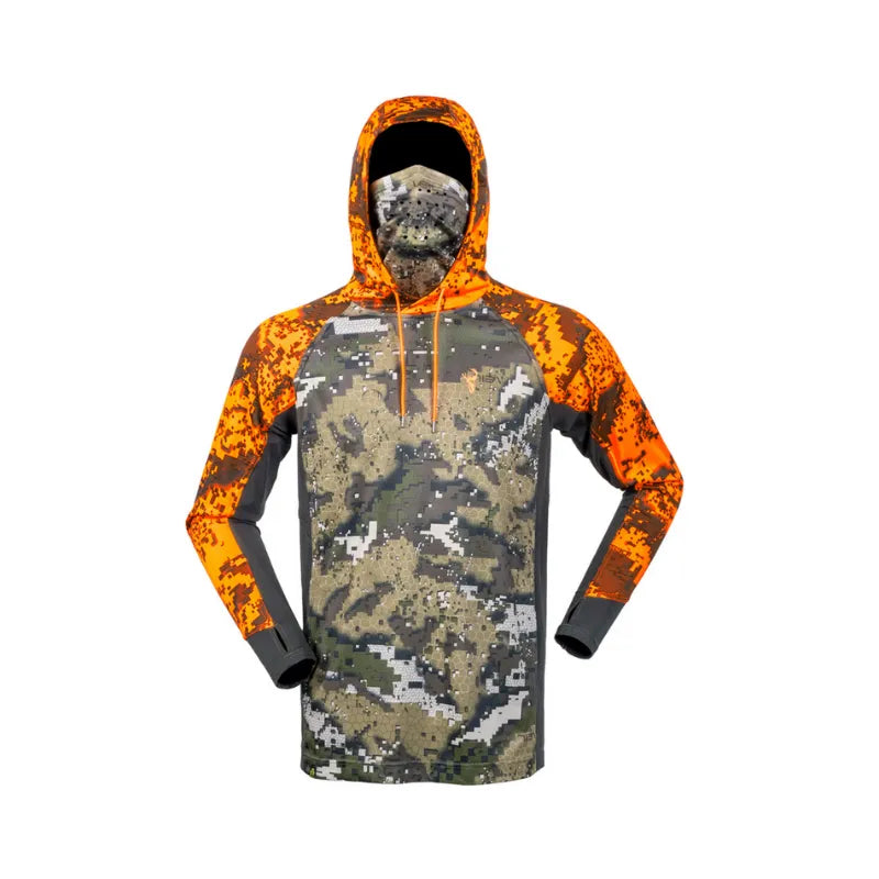 The Vantage Hoodie is a sun shield and sweat vacuum. Made from our famous extreme wicking, bamboo charcoal-infused honeycomb fabric. The key to comfort while performing high-intensity activities in the summer heat is protecting the skin from the sun and removing the uncomfortable sweat that comes with the territory. The Vantage Hoodie has been designed for this job by covering as much of the body as possible and providing the best technology in moisture-wicking fabrics. The hood and integrated face veil can be used not only to shield from the sun but also to provide a stealthier approach for close-quarters stalking. Human skin is particularly bright to deer’s eyes in low light situations. Covering yourself in Desolve camouflage gives you the best possible chance of remaining undetected. It also utilizes two high-performance fabrics in a body-mapped design to allow for maximum movement in the high stretch areas.