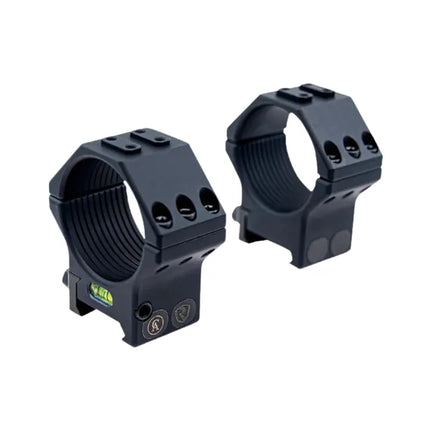 Design: The rings feature six ring screws and a wider ring, providing more surface area for scope contact. Machined grooves on the tube-facing surface improve contact and help prevent slippage.