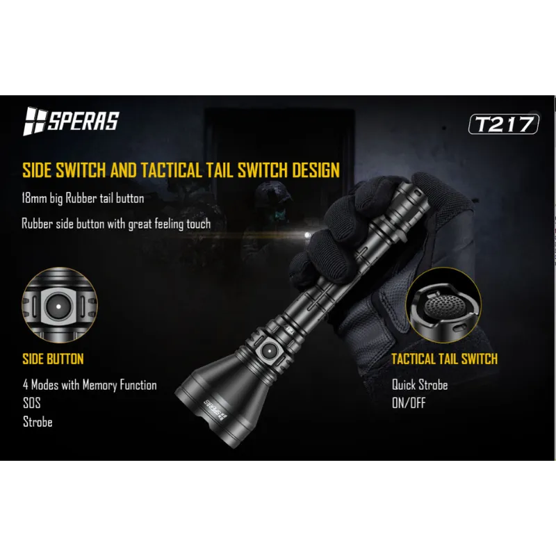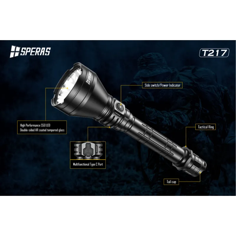 The SPERAS T217 Hunting Flashlight Kit is a comprehensive lighting solution designed for hunters seeking superior performance in the field. With an impressive 1400 meters beam distance and a powerful 1400 lumens output, this flashlight ensures exceptional visibility for tracking and spotting game during hunting expeditions. The kit includes a high-capacity 1000mAh rechargeable battery, providing sustained power for extended use.