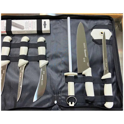 Manufactured using special steel alloy for longer blade life, stain, and rust resistance, our Professional Knives feature a uniquely sharpened angle for more precise and impactful cuts. Our kits include a range of Knives, Cleavers, and Sharpening Steels & Stones specifically selected to suit the relevant applications of the trade.