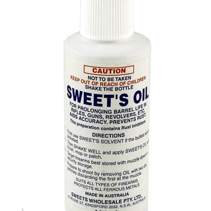 Sweet's lubricating gun oil prolongs barrel life in rifles, guns and revolvers, aids in accuracy, prevents rust and keeps moisture out.